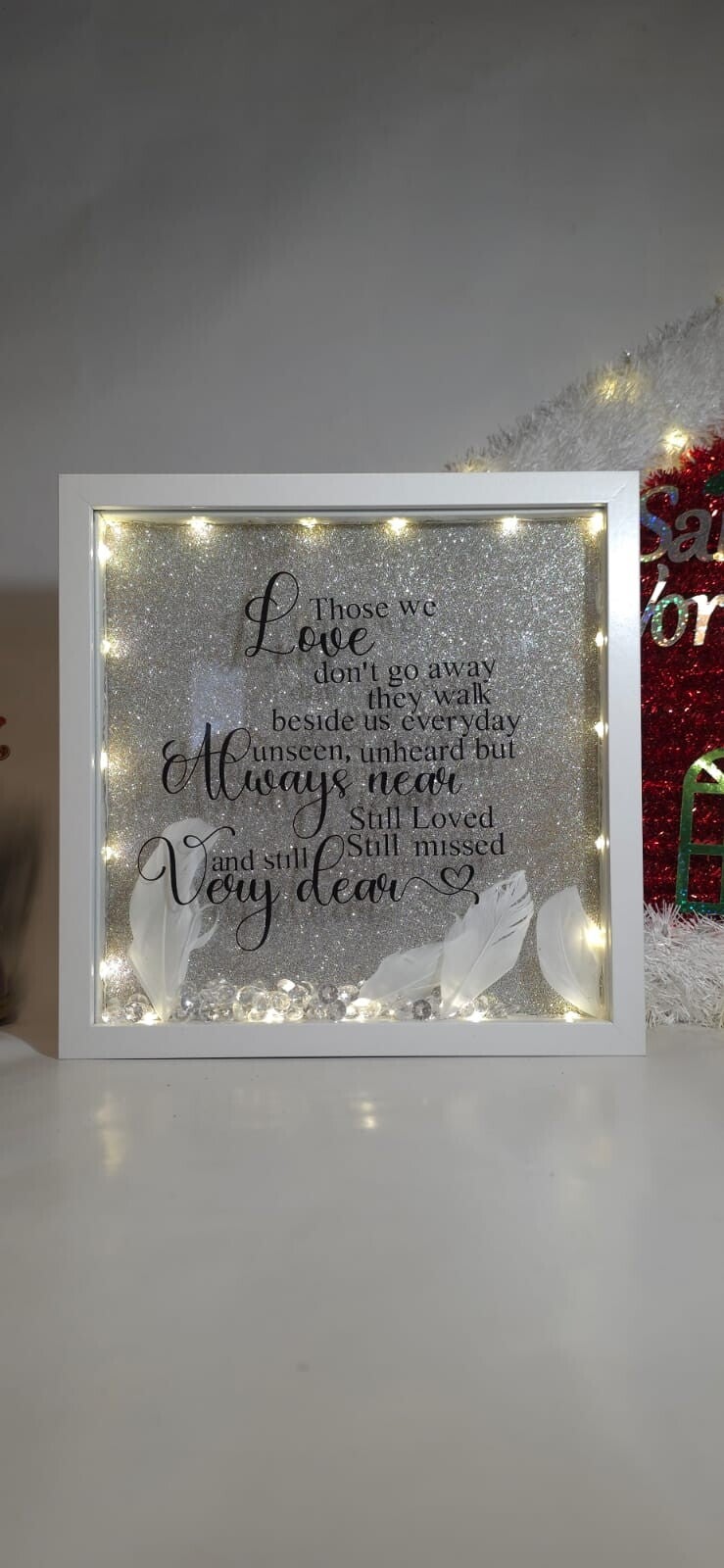 This elegant light-up memorial shadow box features a sparkling glitter background, soft white feathers, and crystal accents. The LED lights gently illuminate the frame, creating a calm and peaceful glow — a beautiful reminder that loved ones may be gone from sight but never from the heart.